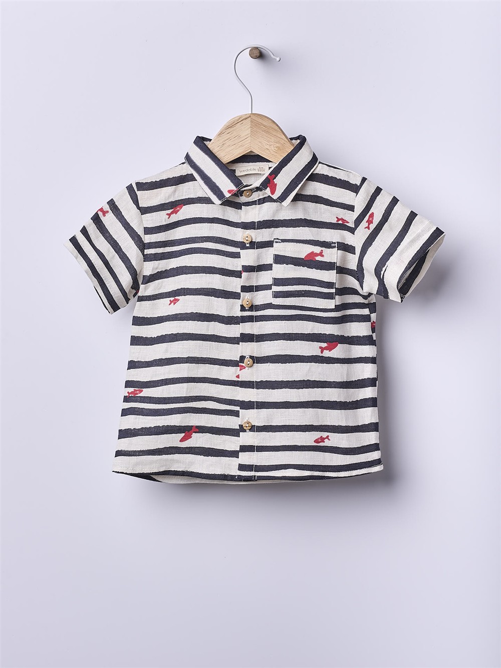 Completo in cotone grezzo a righe panna e nero con pesciolino rossi Wedoble