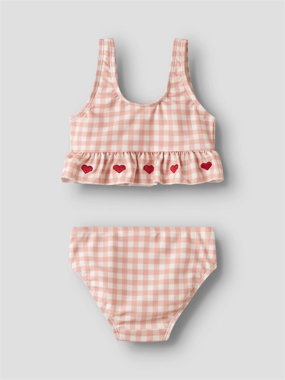 Costume due pezzi in lycra vichy bianco e rosa con cuori rossi