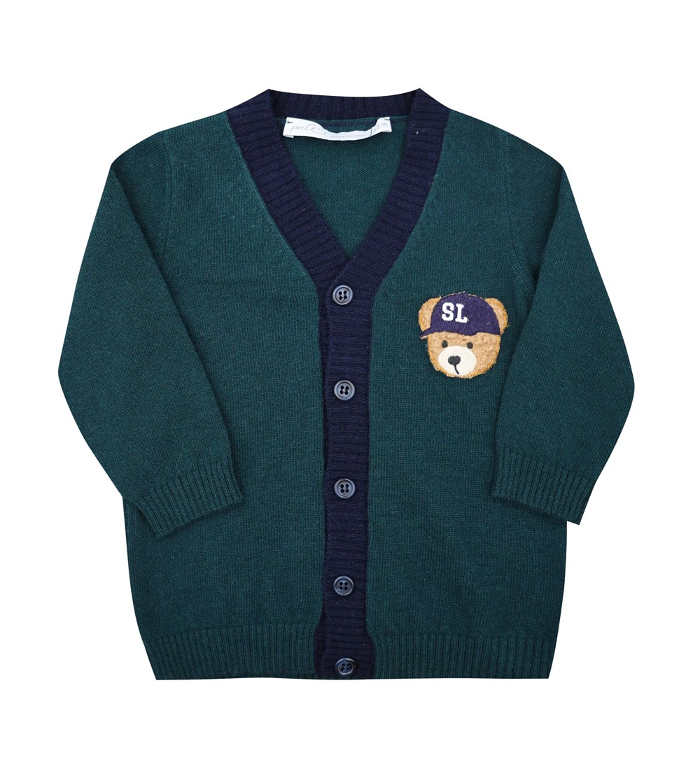Cardigan in lana misto cashmere verdone con profili blu e orsetto