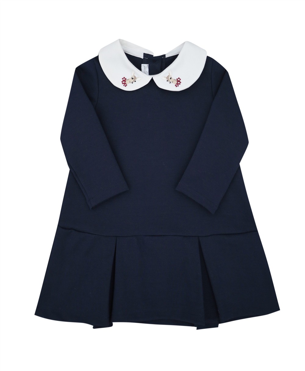 Abito in cotone blu con colletto tondo bianco ricamo cerbiatto bordeaux