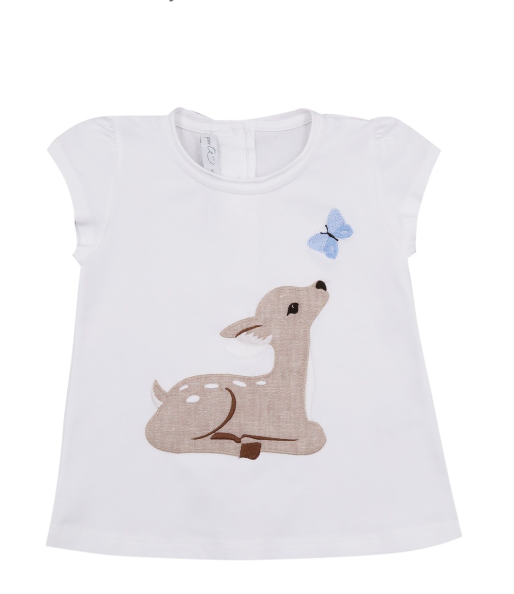T-shirt bianca con cerbiatto ricamato in lino beige e farfalla celeste