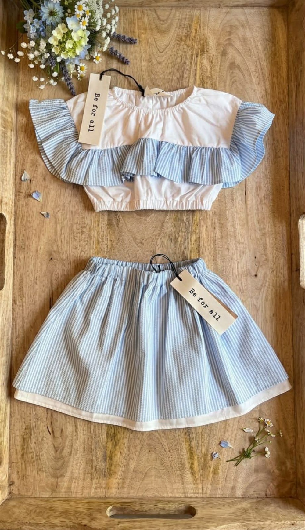 Completo gonna a righe celeste e bianco e top con pettorina rouches