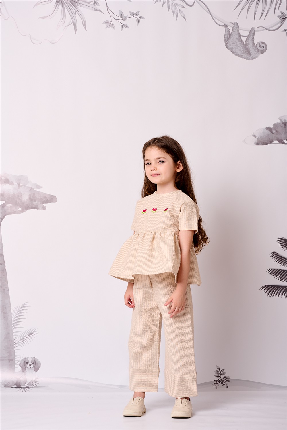 Completo pantalone lungo e blusa a righe panna e rosa con fiori gialli ricamati