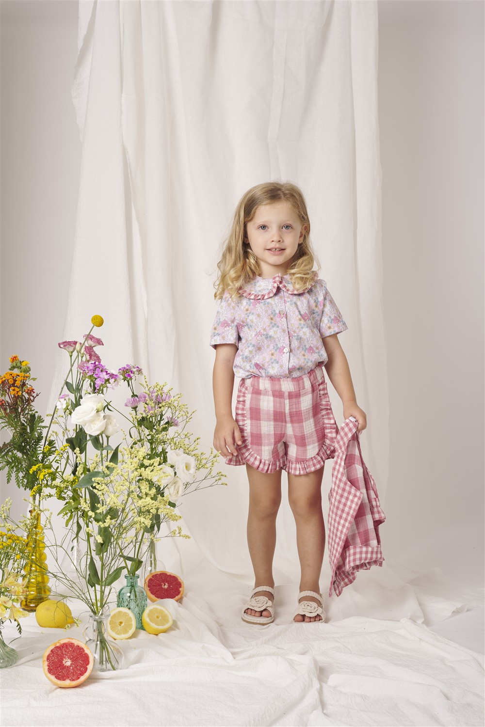 Shorts in cotone goffrato a quadri panna e rosa con rouches laterali